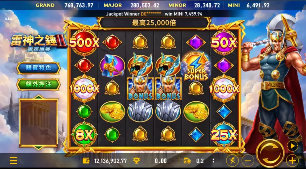 1000 倍的倍數球和 25,000 倍的獎金上限說明了 雷神之錘2 的野心,它不是要你小打小鬧,而是要給你一個追逐傳說的機會。